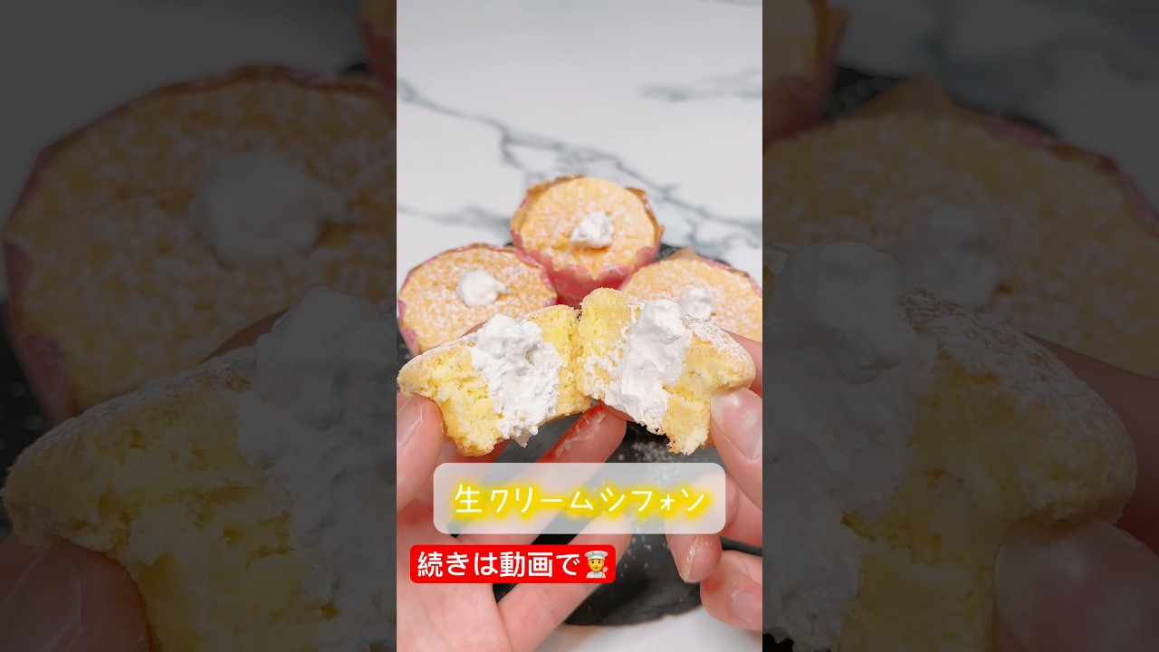 - ・ボウルに2個分の卵白を入れてグラニュー糖 30gを3回に分けて入れ、ツノが立つまで泡立てる ・別のボウルに2個分の卵黄を入れてグラニュー糖30gを入れて白っぽくなるまで混ぜた後、サラダ油大さじ3を入れ混ぜ、水大さじ1を入れて再度混ぜる ・そこに薄力粉60gを振るい入れて粉っぽさが無くなるまでそこからすくうように混ぜる ・さらにメレンゲを少し入れて馴染ませ馴染んだらメレンゲを全部入れて底から優しく混ぜる ・カップに7〜8分目まで生地を入れて 180℃に予熱したオーブンで約20分焼いていく ・焼き上がって冷ましてから竹串で真ん中にホイップの注入口を作りホイップ(生クリーム150ml、グラニュー糖15gを泡立てる)を 注入する ・お好みでシュガーパウダーを振れば出来上がり